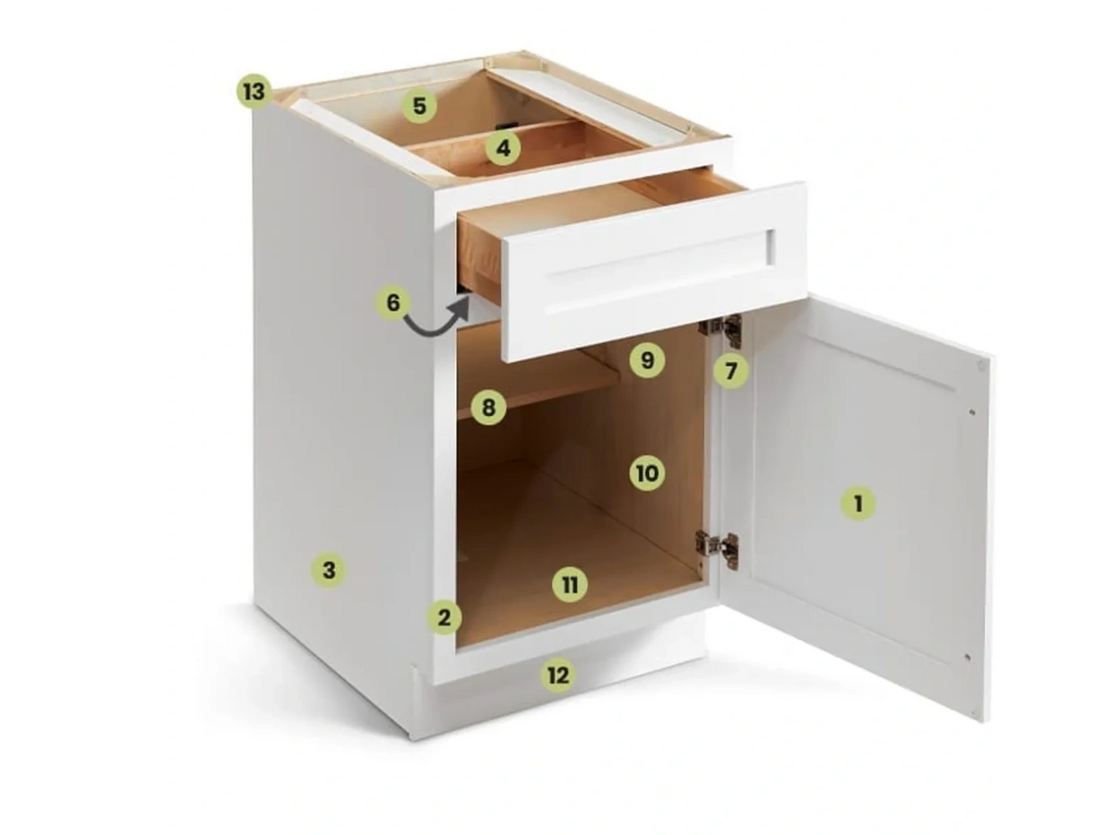 1. 3/4” thick solid hardwood doors and drawer fronts, with engineered center panel for a quality look and feel.